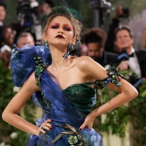 Wearing a John Galliano creation based on a 1999 Dior piece, Zendaya was striking in a royal blue and emerald green dress, with embellishments which looked as if they were inspired by fruit trees.